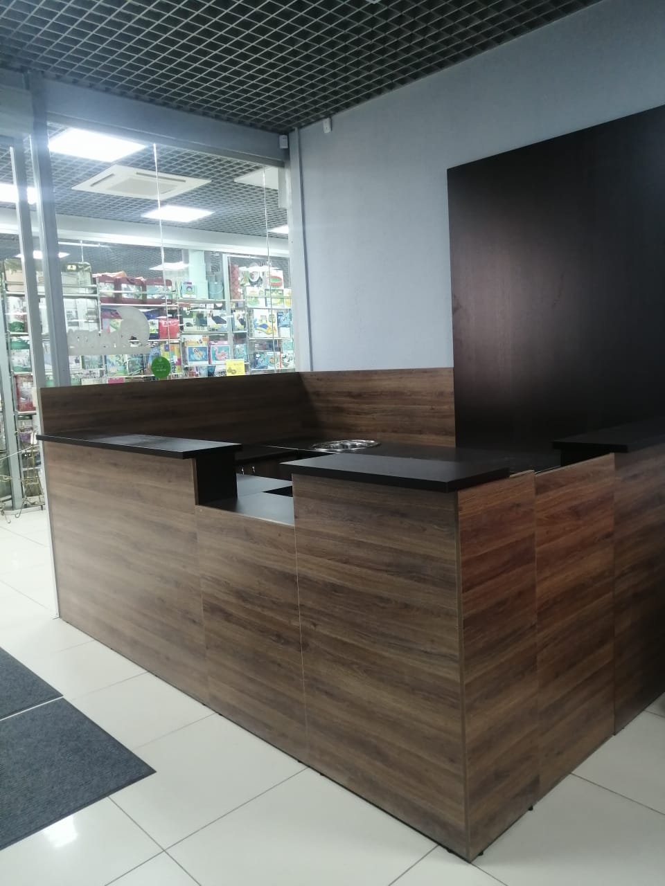 - Широкая столешница позволяет разместить кофе-машину, витрину с выпечкой, разные сорта кофе, а также другие необходимые элементы.