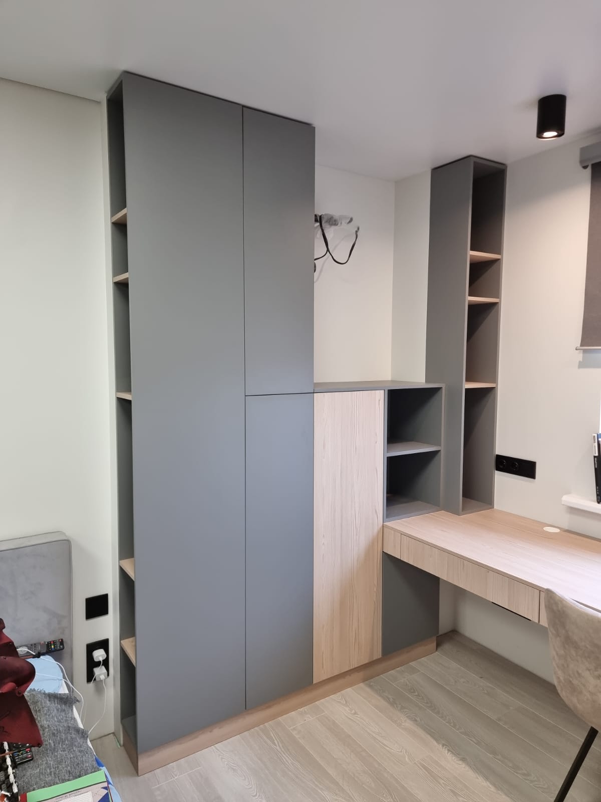Комплект детской «Графит» дает возможность грамотно организовать пространство, учитывая потребности ребенка. В такой комнате он всегда будет ощущать спокойствие, защищенность и максимальный комфорт. В комплекте: большой и вместительный шкаф, несколько стеллажей с полочками и отделами с дверцами, встроенный письменный стол. Есть также навесной шкаф с откидной дверцей, где можно хранить учебники, тетради, школьные принадлежности, игрушки.