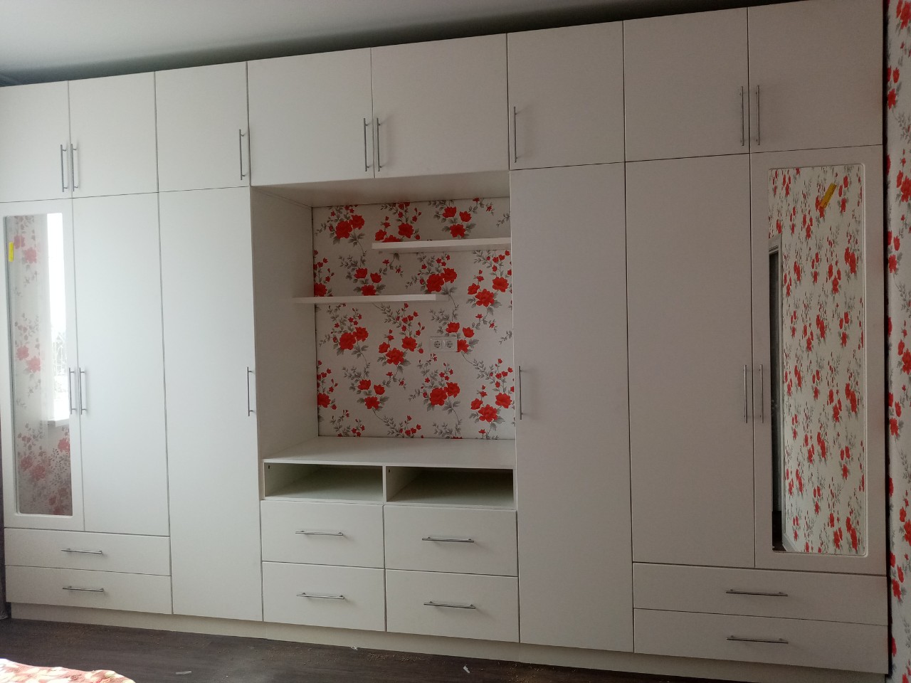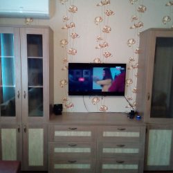 Встроенный шкаф экономит большое количество места. Вам не понадобятся дополнительные полки и комоды: многочисленные выдвижные ящики, распашные отделения и просторные антресоли вместят огромное количество разных вещей. Сюда же – в специальную нишу войдёт и большой телевизор.