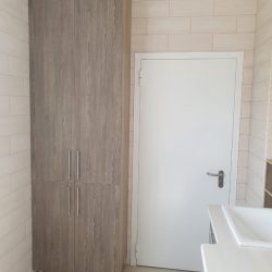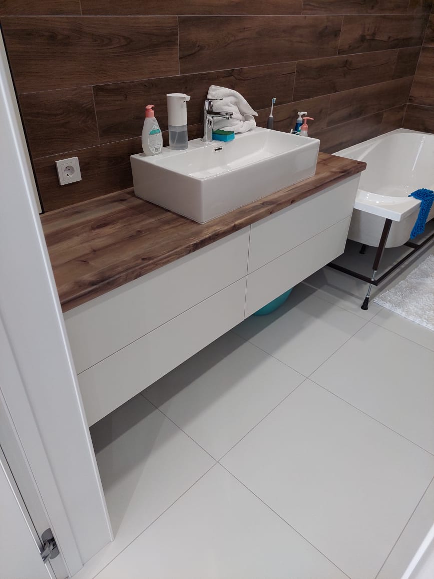 Набор в бело-коричневых оттенках отлично сочетается с сантехническим оборудованием. Мебель изготавливается в соответствии с индивидуальными замерами покупателя. Это позволяет идеально разместить тумбочку и шкаф именно в вашей ванной. Длительность производства такого комплекта – от четырнадцати дней.
