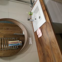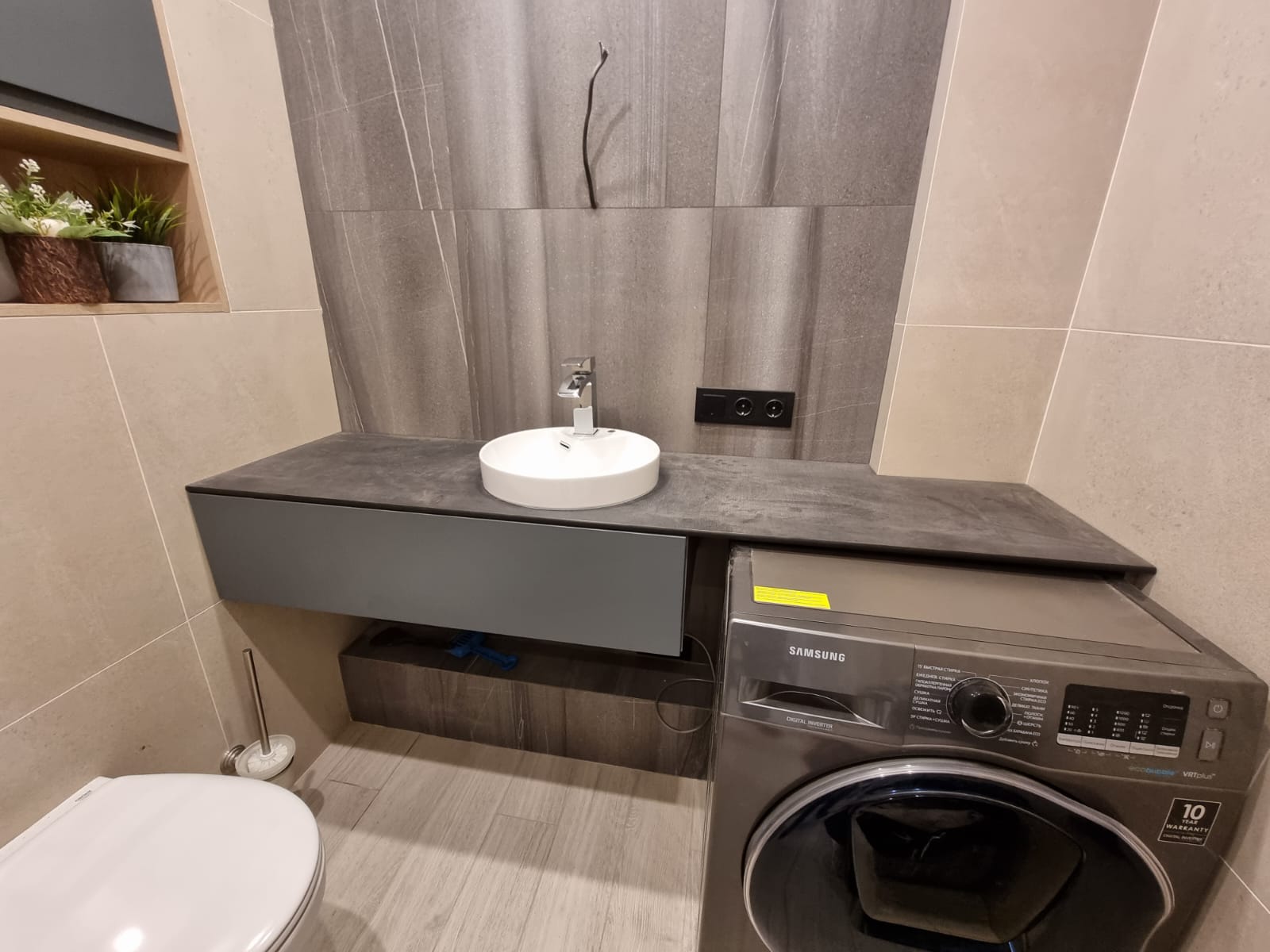 - Многофункциональность. Мебель крепится непосредственно к стене, оставляя свободное пространство на полу. Поэтому под раковиной вполне может разместиться стиральная машина горизонтальной загрузки, а шкафчик может быть установлен в любом другом месте: над умывальником, ванной и даже унитазом, если санузел совмещенный.