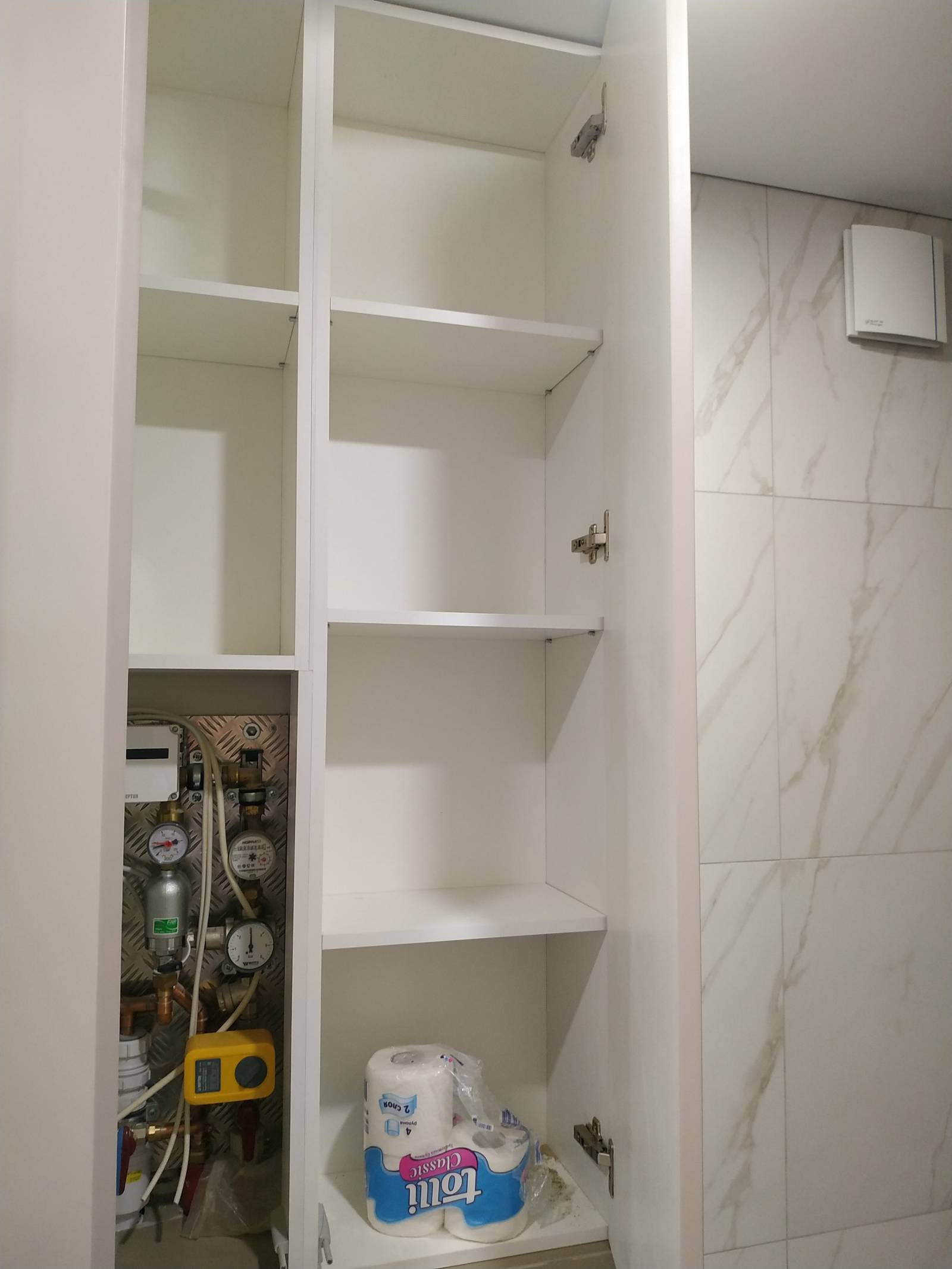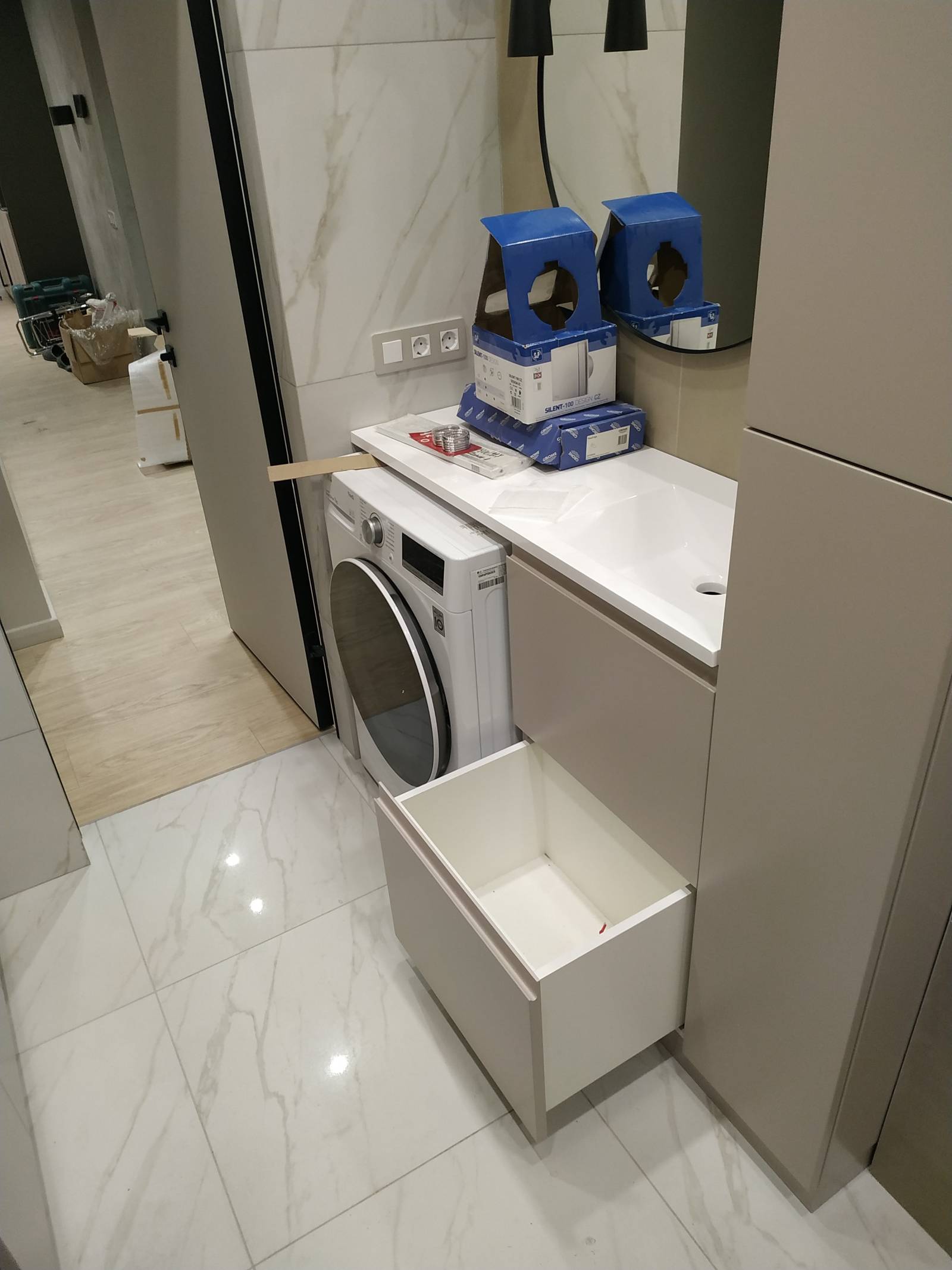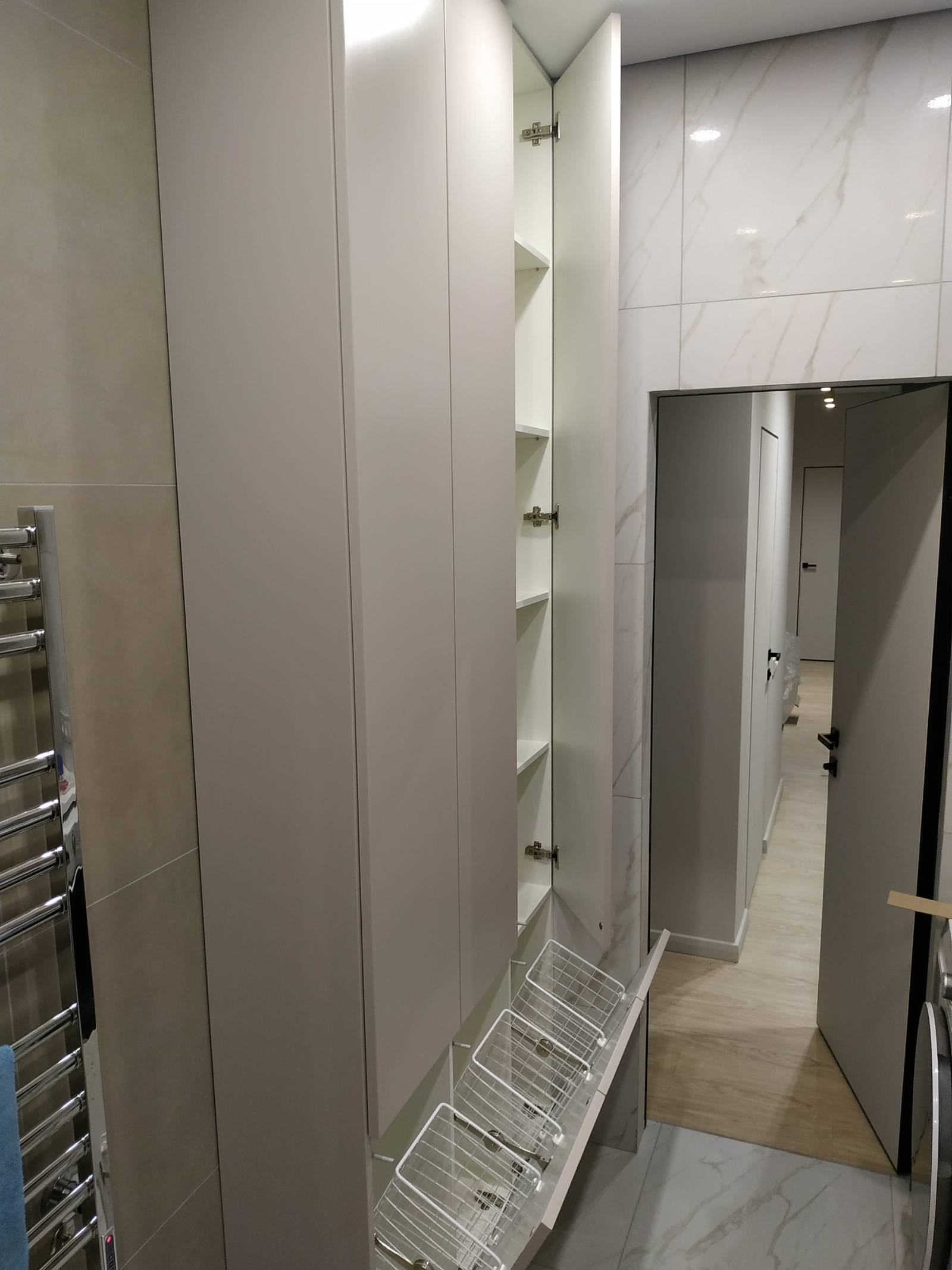 Компоновка модели продуманная. Наличие тумбы с раковиной позволяет разумно организовать хранение гигиенических принадлежностей, бытовой химии, а также аксессуаров. Стиральная машина встраиваемая. Это экономит пространство и создает аккуратный вид помещения. Шкаф-пенал достаточно вместительный. Подходит для хранения бытовых принадлежностей, хозяйственного инвентаря.