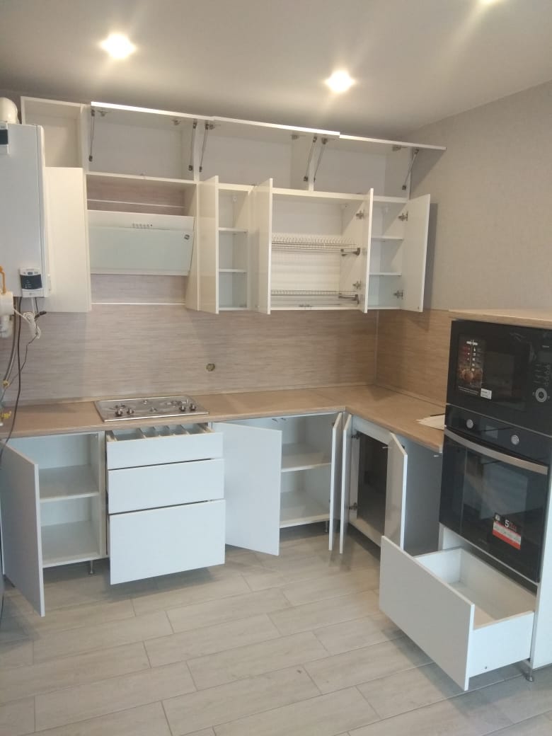 - кухня имеет множество модулей для хранения: верхние антресоли, выдвижные ящики, объемные шкафы, внутренние металлические системы;
