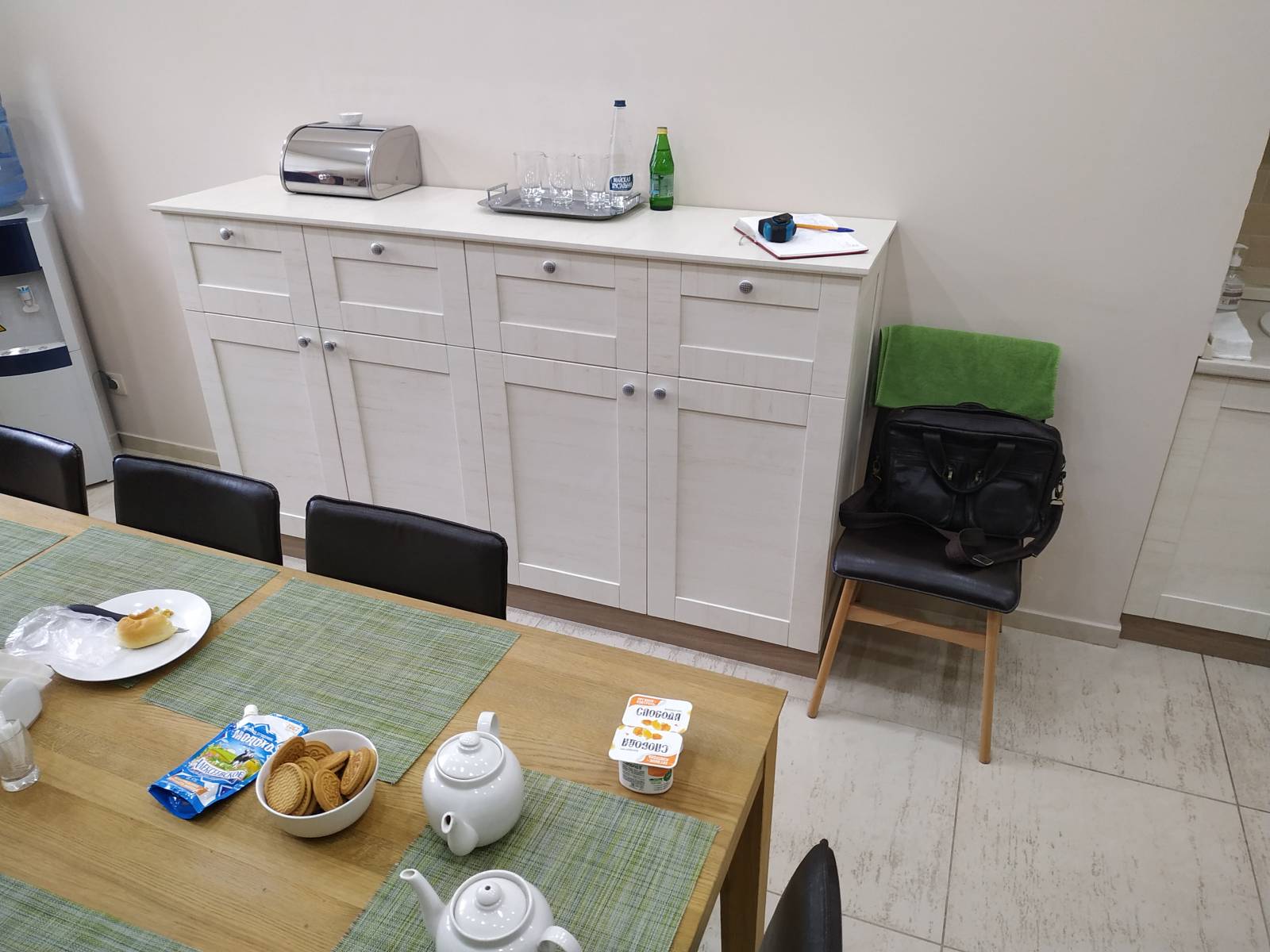 Белый цвет визуально расширит пространство, а современный дизайн сделает обеденный перерыв работников ещё приятнее.