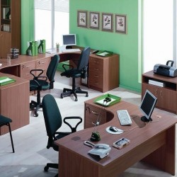 В комплект входит прямоугольный классический стол с выдвижной полочкой для клавиатуры и боковой тумбой с ящиком и нишей для бумаг, а также низкие закрытые шкафы.