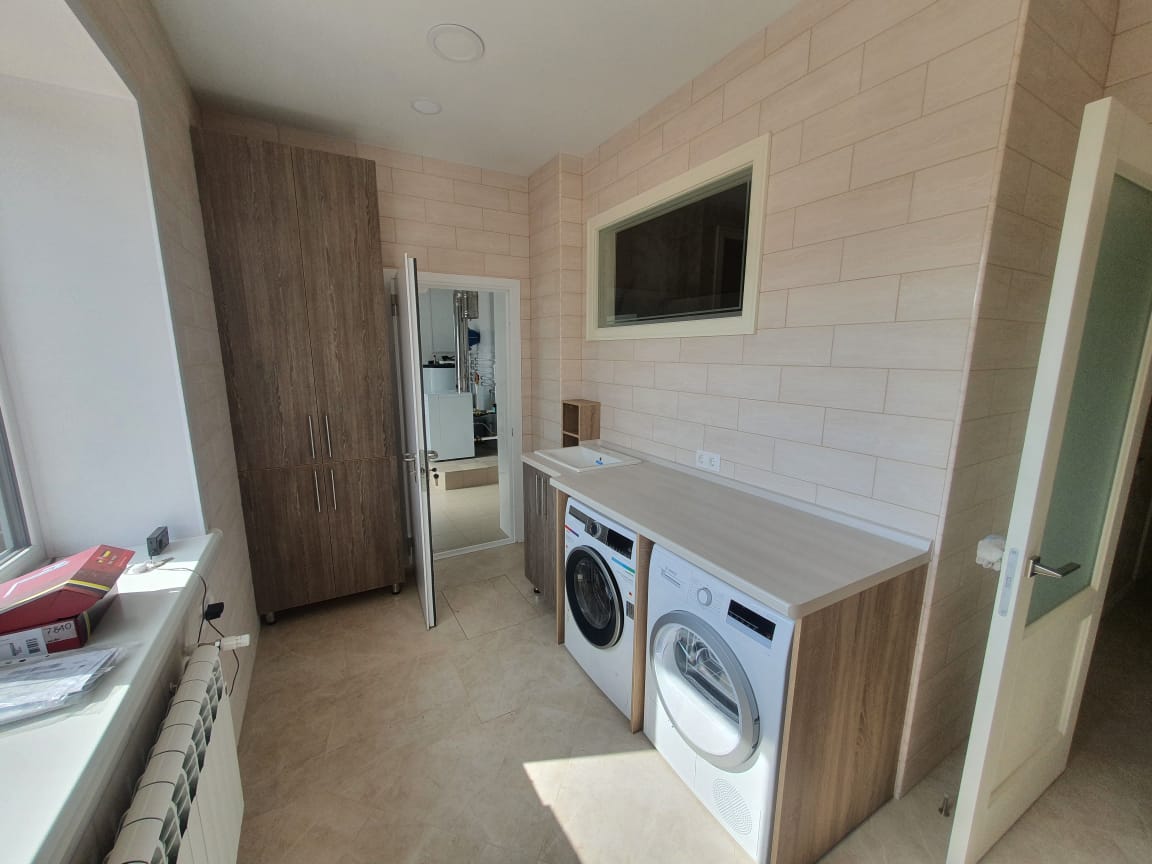 Тумба с местом под технику обеспечивает удобный доступ к стиральной и сушильной машинам. Размеры конструкции подходят для просторных помещений.