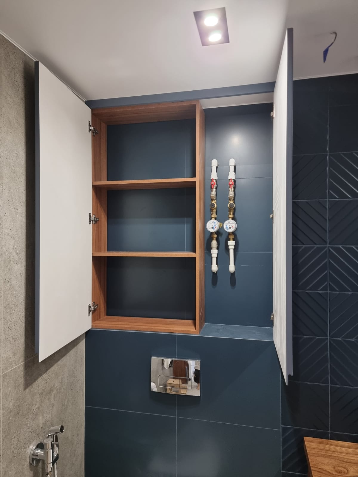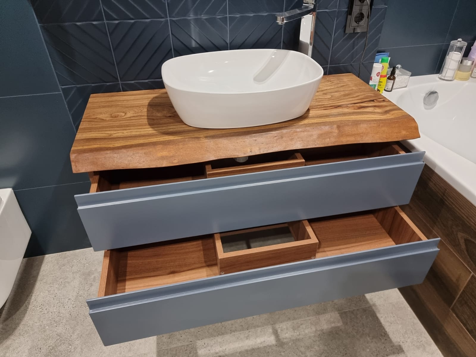 Этого вполне достаточно, чтобы разместить все необходимые для ванной комнаты вещи. На полках можно расставить бутылки, банки и тюбики с уходовой косметикой или средствами личной гигиены. Здесь отлично расположится зубная паста и щётка. В ящиках же – самое место для махровых и вафельных полотенец.