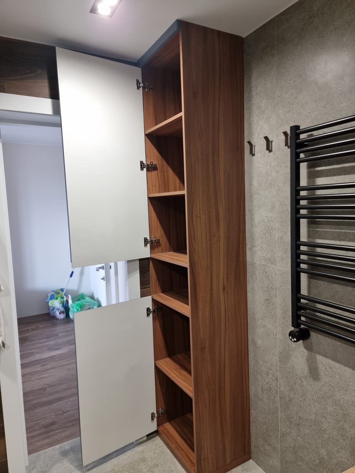 Шкаф-пенал разделён на шесть полок. У него две двери. Верхняя длиннее нижней. Это связано с тем, что одна из них закрывает три полки, а другая – только две. Таким образом, в середине шкафа остаётся небольшое открытое пространство.