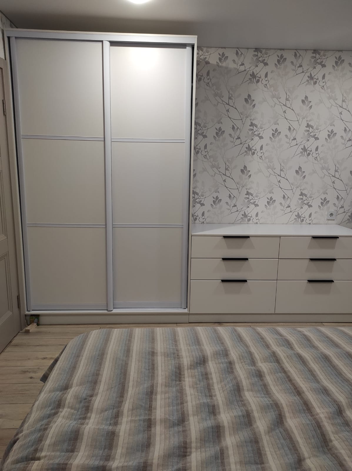 Мебель для спальни – неотъемлемая часть комфортного быта. В комплект «Карина» входят двустворчатый шкаф-купе, комод и прикроватная тумба. Вся модель изготовлена в едином лаконичном стиле, поэтому она идеально впишется в любое интерьерное решение. Так, матовые фасады шкафа украшены привлекательными стальными вставками, повышающими износостойкость конструкции.