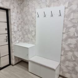 - В прихожей располагаются невысокие шкафы для верхней одежды, которые не утяжеляют общий вид и чрезвычайно функциональны. Небольшие по размеру ручки-квадраты выглядят необычно и оригинально.
