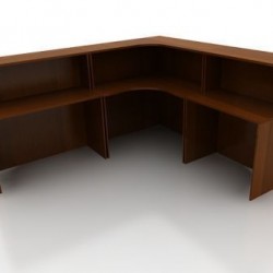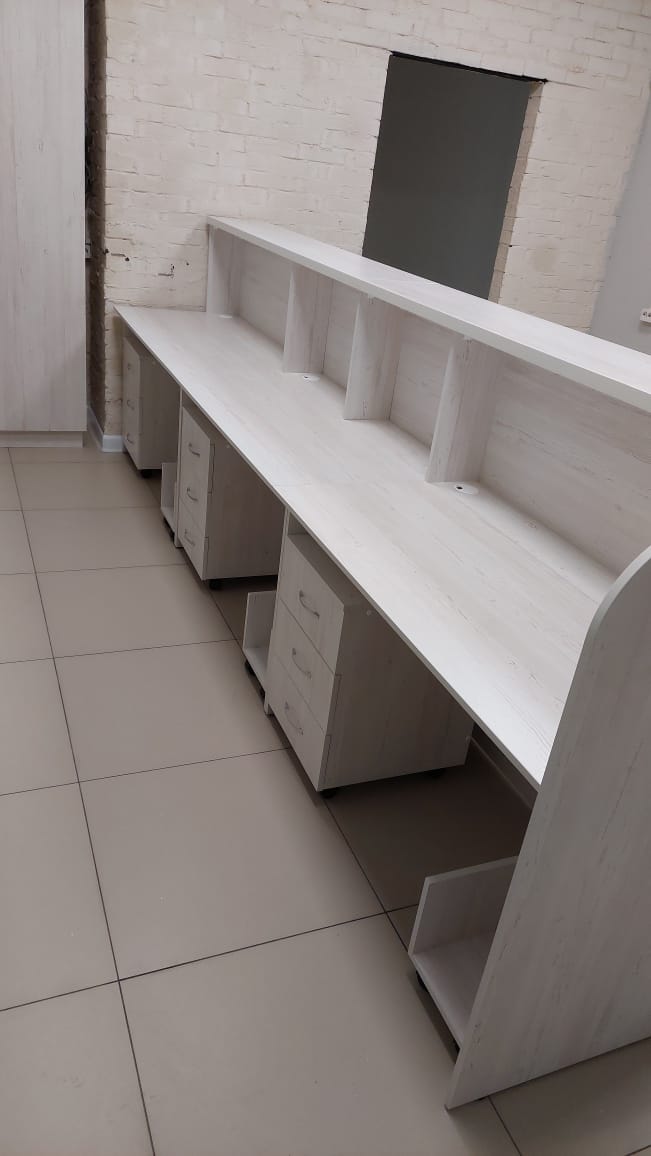 - В конструкцию входят тумбы для техники (компьютер, принтер, факс), распашной шкаф для документов, столешница для работника и стойка для приема посетителей, крепеж и фурнитура.