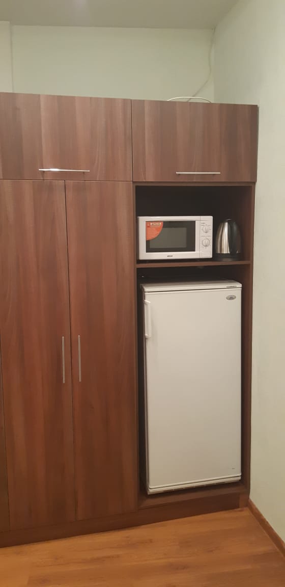 - Отдельные ниши под бытовую технику – здесь удобно разместились мини-холодильник, микроволновая печь и электрический чайник.