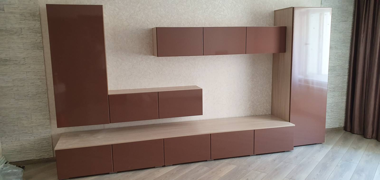Стенка состоит из нескольких отдельных небольших закрытых ящиков и более крупных шкафов. Часть из них устанавливается на полу, а другая крепится на стене. В конструкции продумано и предусмотрено пространство не только для хранения вещей, но и для установки телевизора.