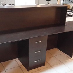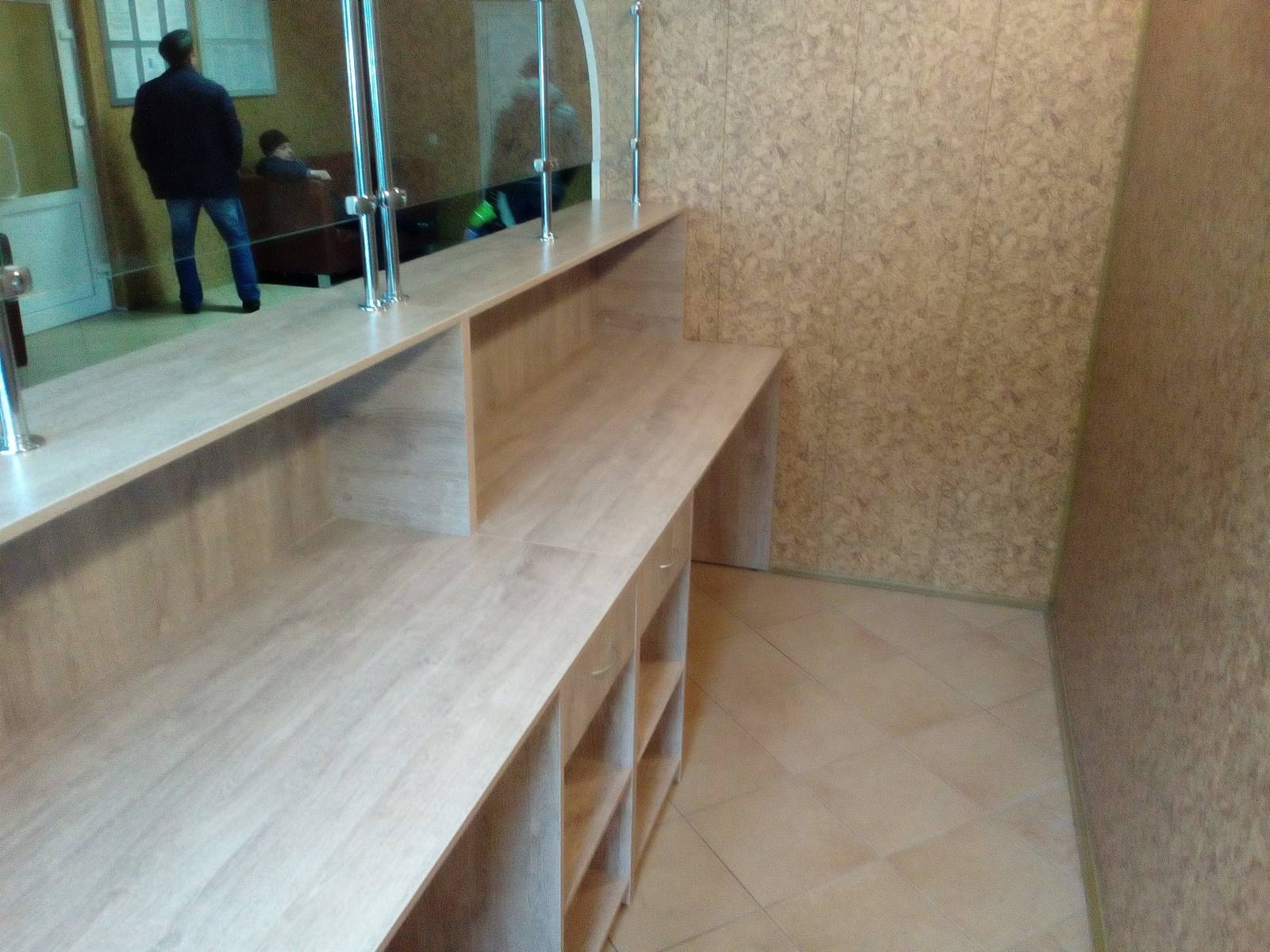 Столешница и заполнение изготовлены из ламинированной древесно-стружечной плиты, устойчивой к царапинам, влаге, химическим реагентам. Размеры столешницы позволяют разместить на поверхности оборудование, оставив место для посетителей, которым нужно заполнить или подписать документы.