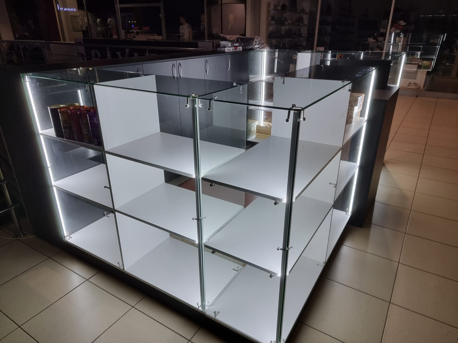Установить островок можно в торговом центре или любом проходном месте. Со всех сторон он защищает работника и аксессуары от посторонних воздействий. Никто не получит доступ к вещам из витрины, если их не достанет продавец.
