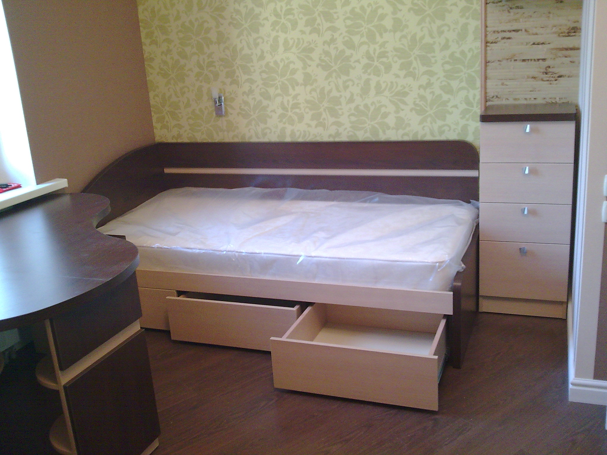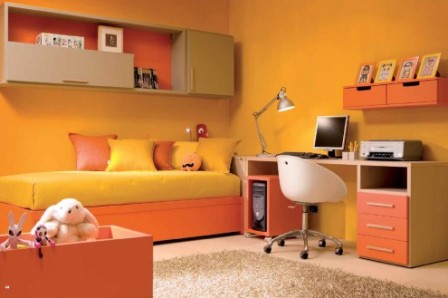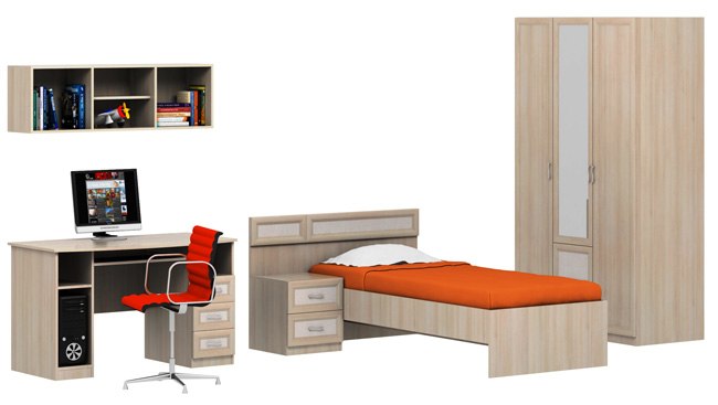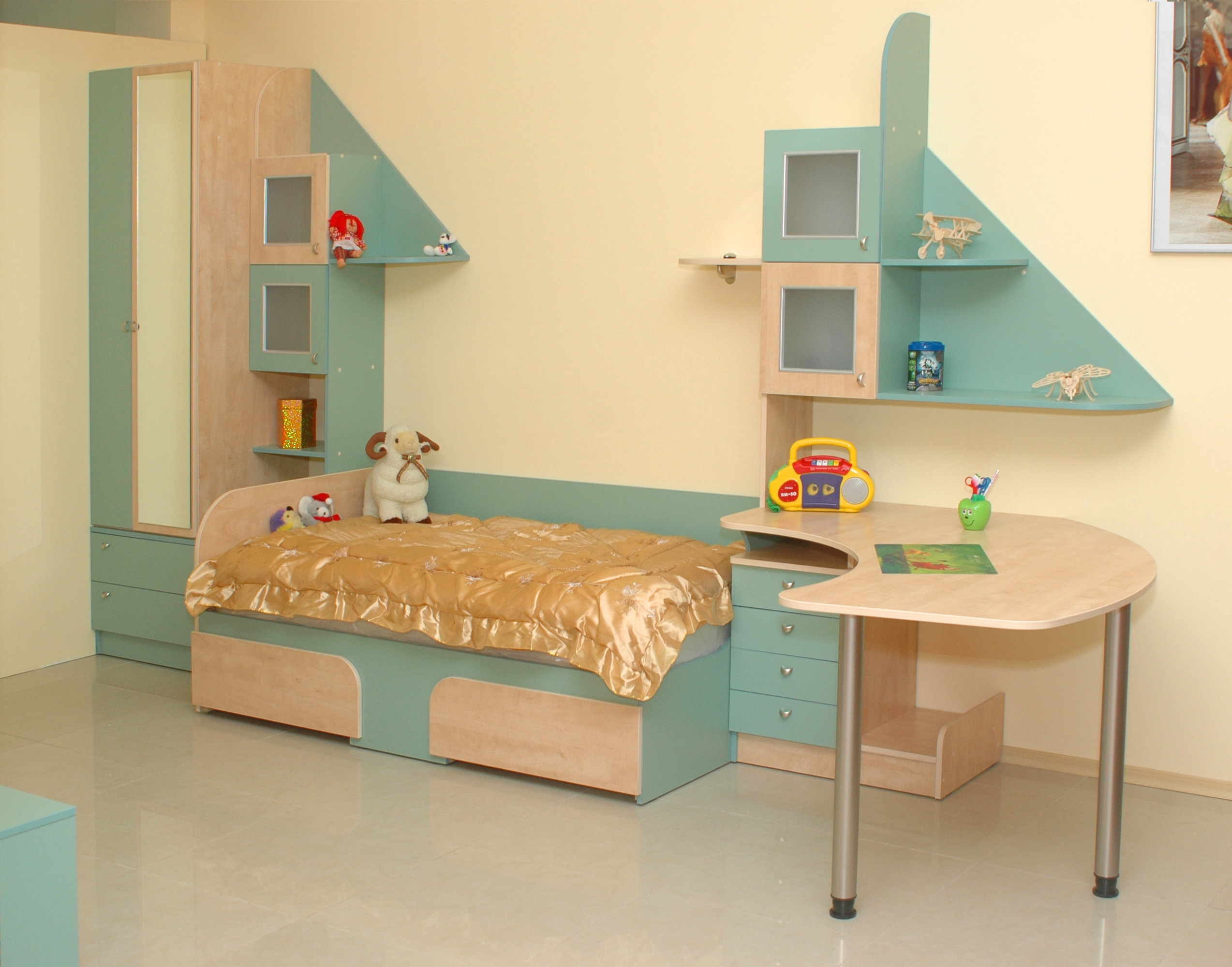 Мебель для детей и взрослых отличается по составу. В детских спальнях обычно нет шкафов со стеклянными дверями, есть письменные столы для выполнения школьных заданий, цвета более яркие, чем у мебели для взрослых.