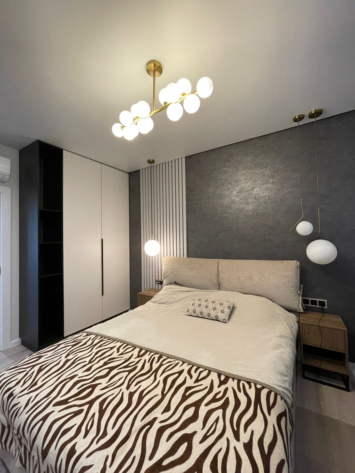 Прикроватные тумбочки и оригинальные торшеры помогают дополнить пространство. Они придают помещению уют, а хозяева могут спокойно читать перед сном любимую книгу. Иногда сооружают специальную нишу в стене, на которой удобно хранить личные вещи. Дополнят интерьер картины на стенах, фотографии, милые безделушки на полках и прикроватные коврики. Все эти мелочи и качественная мебель позволят создать уютную спальню.